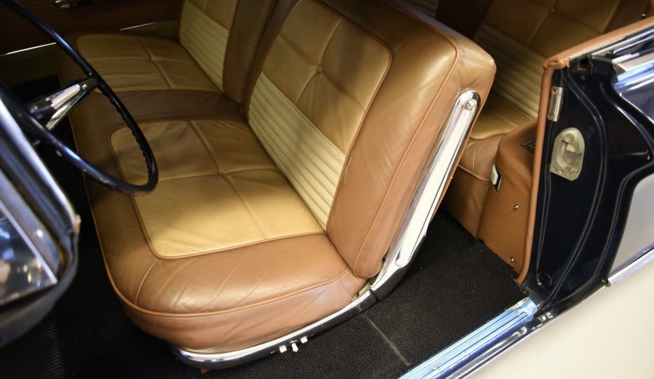 Exteriéru dominuje hluboký modrý lak v kombinaci s white wall pneumatikami a ozdobnou boční lištu, která byla pouze u nejvyššího modelu Electra 225. Chromy vypadají velmi dobře a celkově se jedná o ikonický kabriolet v krásné barevné kombinaci a skvělém stavu.